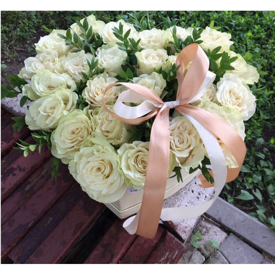 25 белых свежесрезанных роз в коробке в виде сердца - это идеальная композиция для признания, которая покажет искренность и глубину Ваших чувств избраннице. Трепетные нежные лепистки роз наполнят день получательницы светом и сладким ароматом, а Ваши чувства не останутся безответными.
