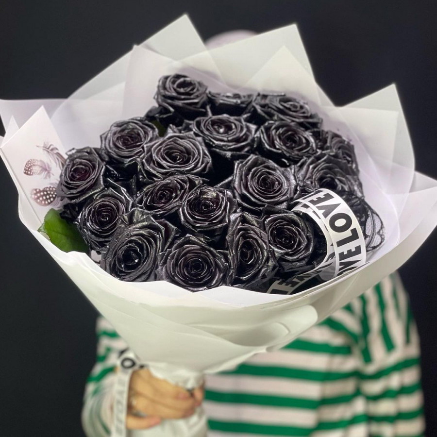 На фото букет из 21 черной розы. В составе: роза 21 шт, крафт-бумага 1 шт, атласная лента 1 шт, . Все цветы свежие и ароматные, букет красиво оформлен и отлично подходит для подарка. Доступна доставка цветов или самовывоз.