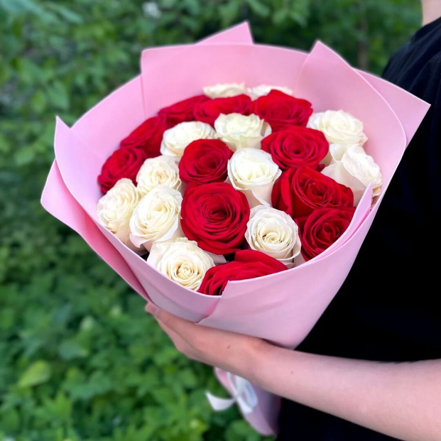 На фото букет из 23 красных и белых роз. В составе: роза 23 шт, крафт-бумага 1 шт, атласная лента 1 шт, . Все цветы свежие и ароматные, букет красиво оформлен и отлично подходит для подарка. Доступна доставка цветов или самовывоз.