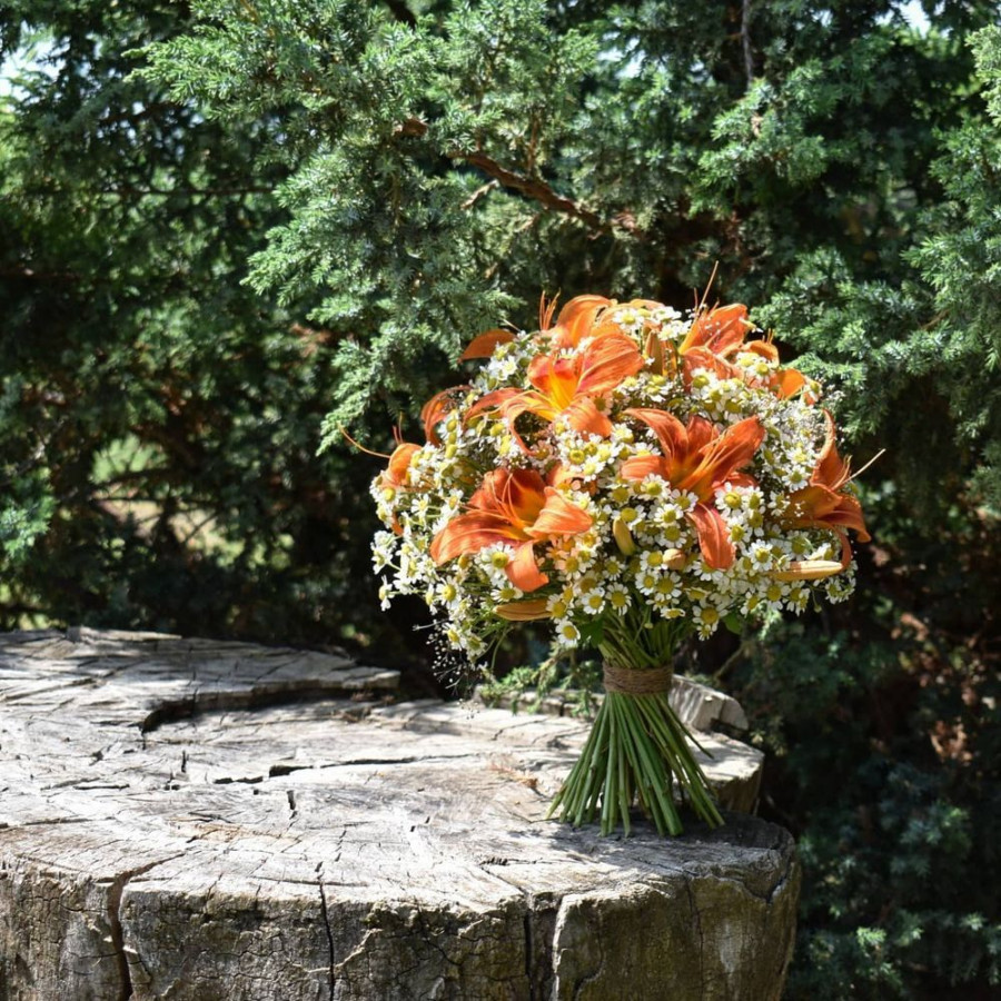 На фото букет из лилий и ромашек. В составе: лилия 11 шт, танацетум 9 шт, атласная лента 1 шт, . Все цветы свежие и ароматные, букет красиво оформлен и отлично подходит для подарка. Доступна доставка цветов или самовывоз.