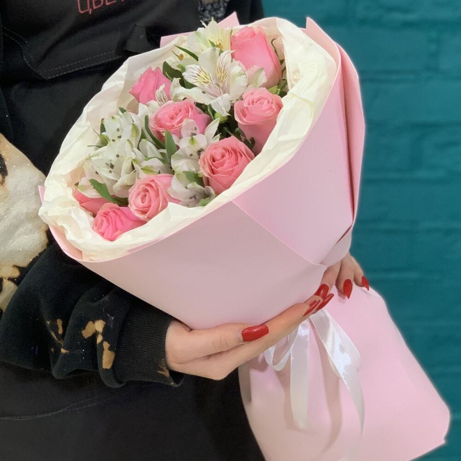 На фото букет «очарование чувств». В составе: роза 9 шт, альстромерия 3 шт, фоамиран 2 шт, атласная лента 1 шт, . Все цветы свежие и ароматные, букет красиво оформлен и отлично подходит для подарка. Доступна доставка цветов или самовывоз.