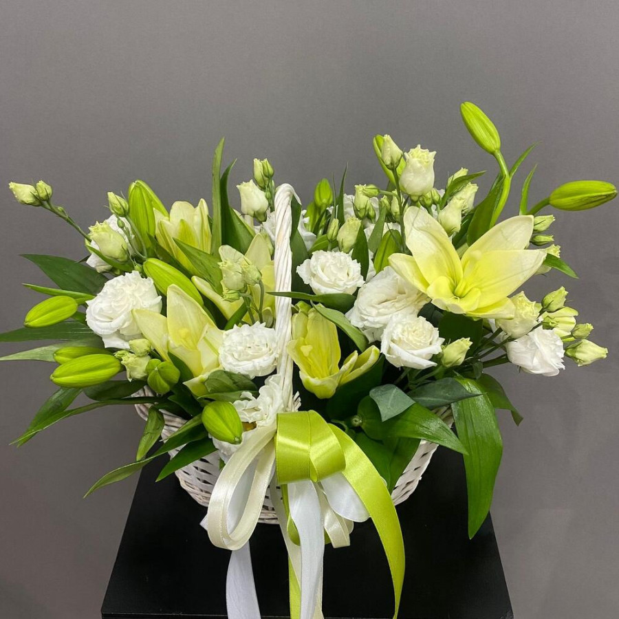 Корзина с белыми лилиями и эустомами