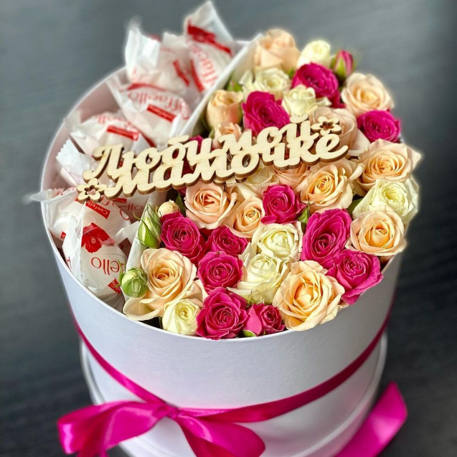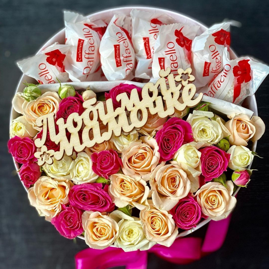 На фото кустовые розы с рафаэлло в коробке. В составе: кустовая роза 7 шт, raffaello 1 шт, шляпная коробка (s) 1 шт, . Все цветы свежие и ароматные, букет красиво оформлен и отлично подходит для подарка. Доступна доставка цветов или самовывоз.
