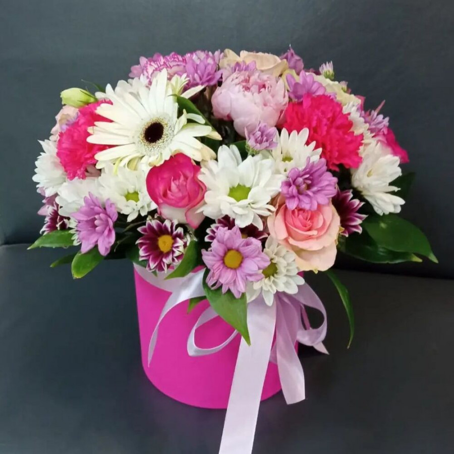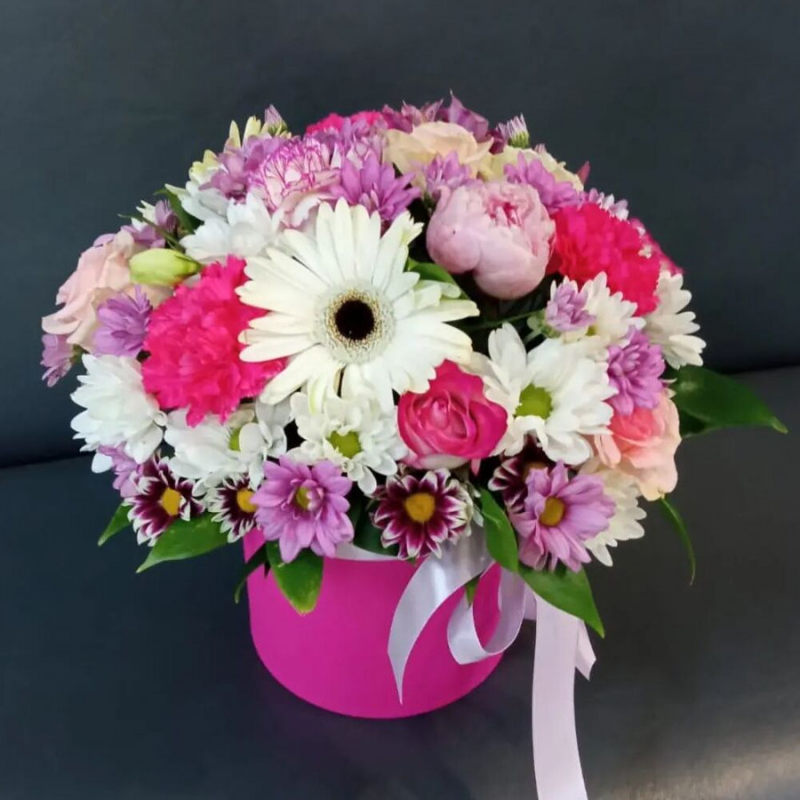 На фото розы, герберы и хризантемы в коробке. В составе: роза 5 шт, хризантема кустовая 7 шт, гвоздика 2 шт, пион 1 шт, гербера 1 шт, кустовая роза 2 шт, корзина (m) 1 шт, . Все цветы свежие и ароматные, букет красиво оформлен и отлично подходит для подарка. Доступна доставка цветов или самовывоз.